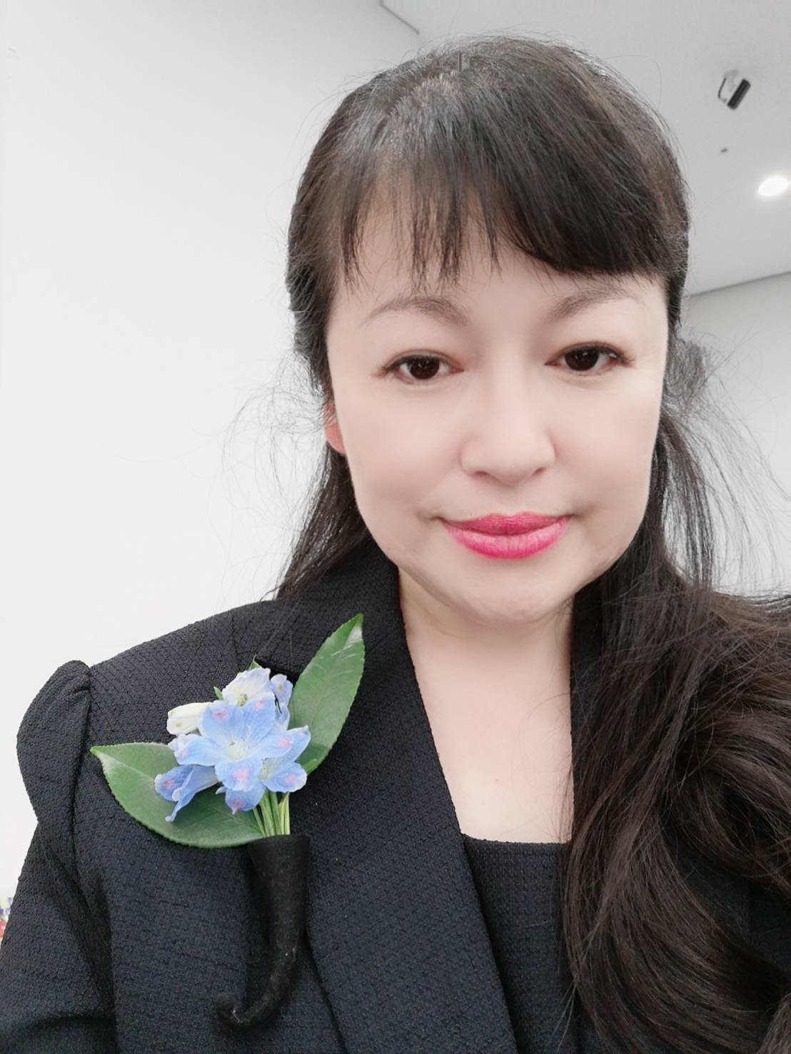 胸につけている生花は食道がんのキャンサーカラー『ペリウィンクル』