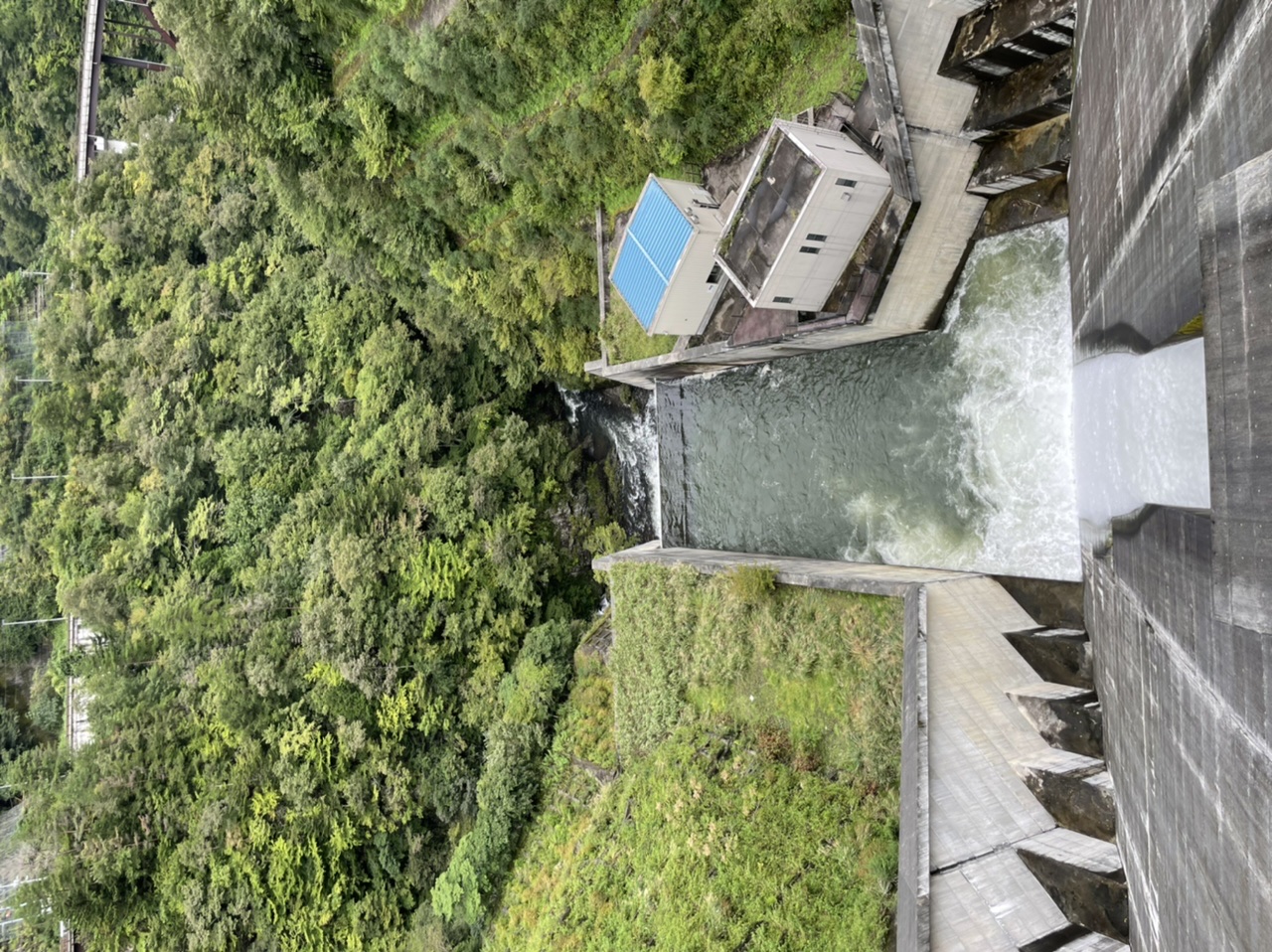 写真は小菅村に向かう途中にあった山あいの小さなダム、深城(ふかしろ)ダムです。放流中でした。