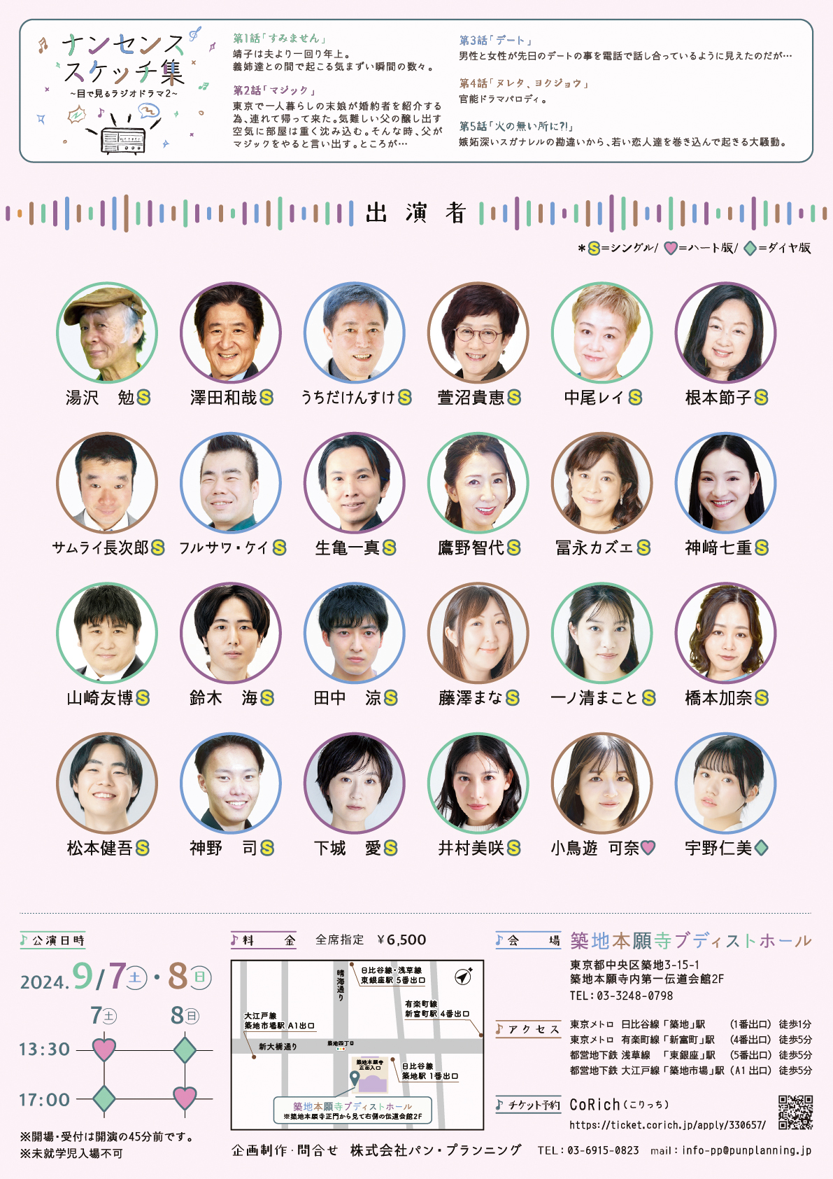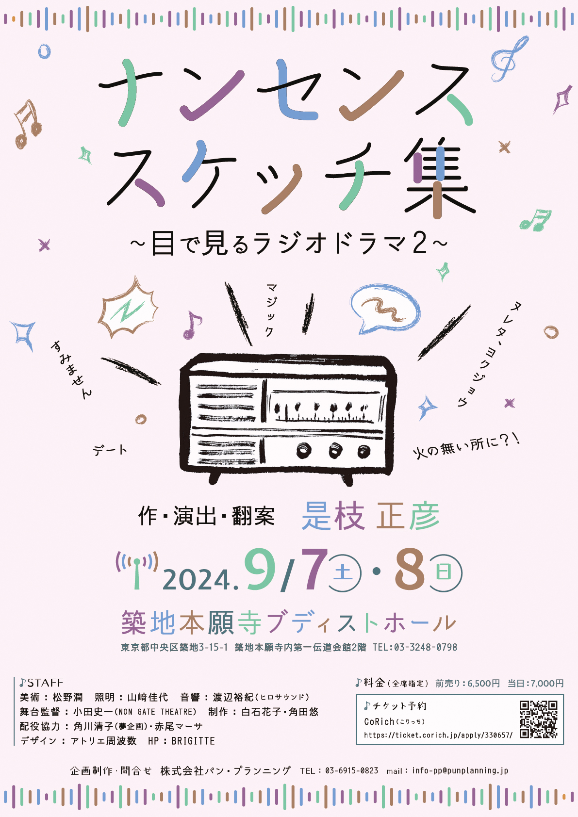 9/7(土)、8(日)の2日間、築地ブディストホールで、舞台「ナンセンススケッチ集〜目で見るラジオドラマ2〜」が上演されます。5つのお話から成るオムニバス作品。各日、13:30〜と17:00〜の2公演です。