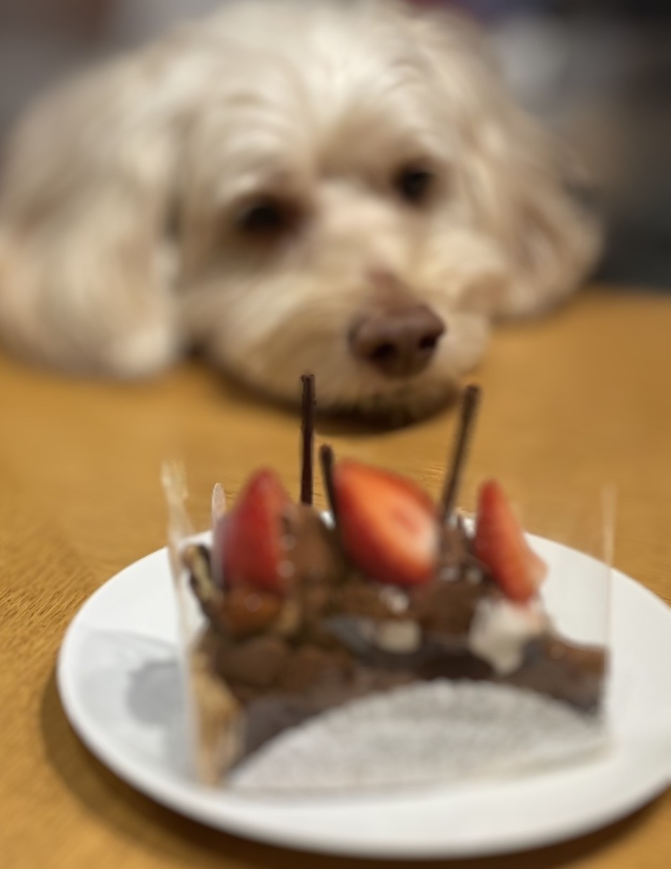 そして、我が家恒例、食後の”お茶の時間”に家族4人で4つのケーキをシェア。羨ましそうにテーブルに顔を載せる愛犬・ルーク…