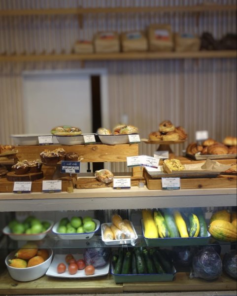 地元の人で賑わうベーカリーは、丘の上から海を見下ろせる立地で、焼きたてのパンやピザ、ケーキなどが楽しめます。