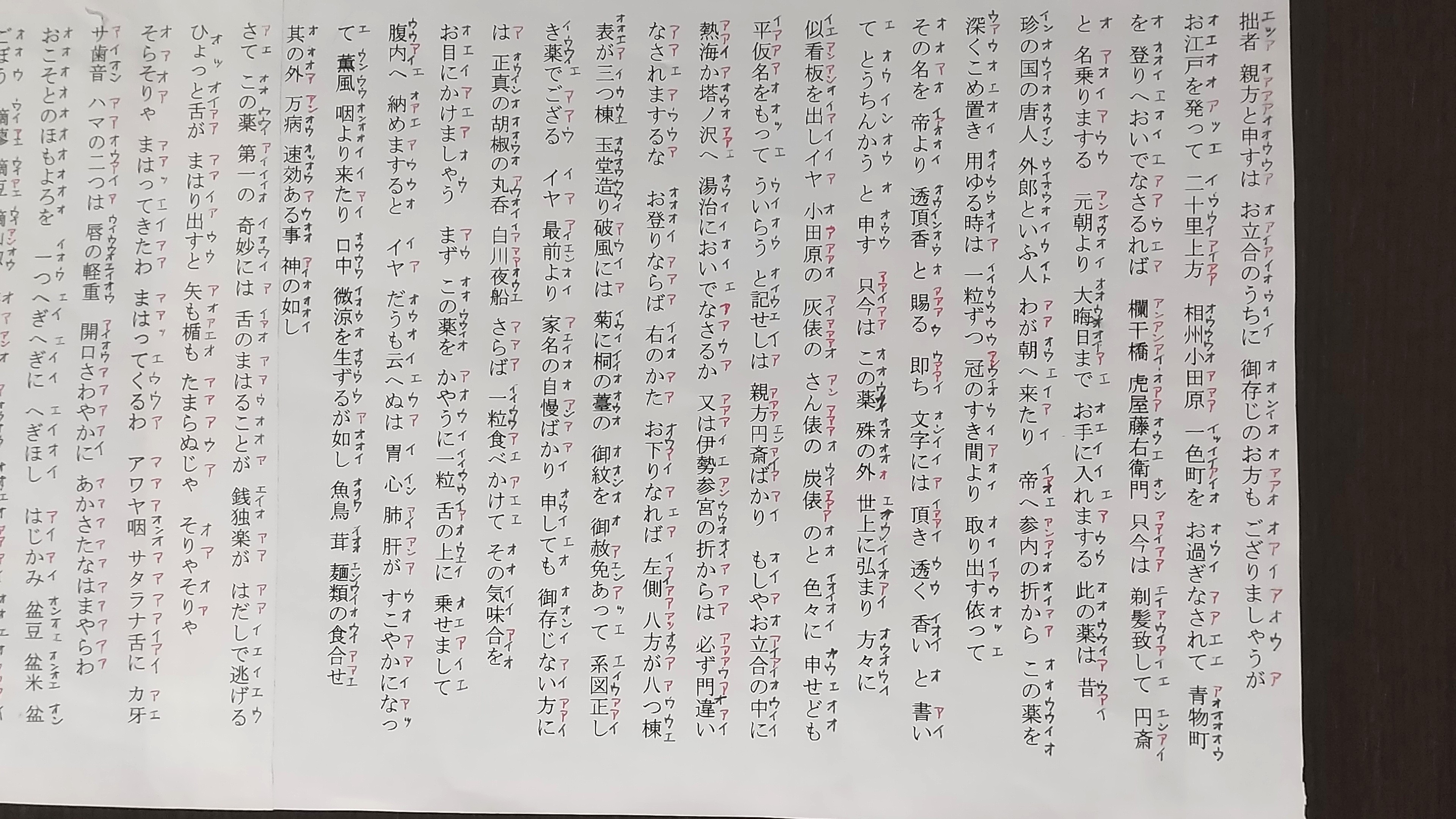 「外郎売り」を一枚のプリントにしたものをドアに貼って、それを見ながらやります。全ての字には、母音をふりました。ァは赤色、ェは青色、その他の文字は黒色と、少しでも分かりやすくなるようにペンの色を変えてます。母音をふるのは根気が入りましたが、必要な作業だったと思います。一回自力でやってみると、母音変換力がアップします、したような気がします。